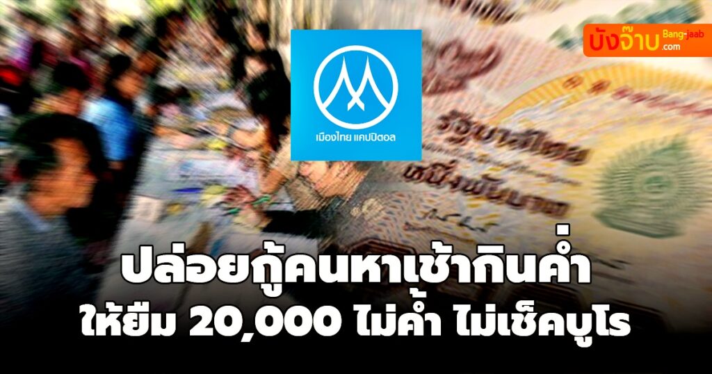 วันนี้ Bang jaab.com จะขอแนะนำ สินเชื่อเงินกู้ เงินกู้ด่วน ไม่เช็กบูโร เงินกู้ถูกหมาย สำหรับ สินเชื่อส่วนบุลคล จาก เมืองไทยแคปปิตอล มีวงเงินกู้ยืม สูงสุดที่ 20,000 บาท ไม่ต้องใช้คนค้ำประกัน อนุมัติเงินทันใจใน 1 วัน