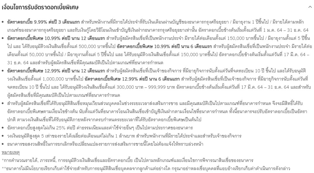 พิเศษสุด ทางธนาคาร กรุงศรี ได้จัดโปรพิเศษ อัตราดอกเบี้ย 9.99% ต่อปี 3 เดือนแรก สำหรับพนักงานที่มีรายได้ประจำที่รับเงินเดือนผ่านบัญชีของธนาคารกรุงศรีอยุธยา / มีอายุงาน 1 ปีขึ้นไป / มีรายได้ตามหลักเกณฑ์ของธนาคารกรุงศรีอยุธยา และรับเงินกู้โดยวิธีโอนเงินเข้าบัญชีเงินฝากธนาคารกรุงศรีอยุธยาเท่านั้น อัตราดอกเบี้ยข้างต้นเริ่มตั้งแต่วันที่ 1 ม.ค. 64 – 31 ธ.ค. 64