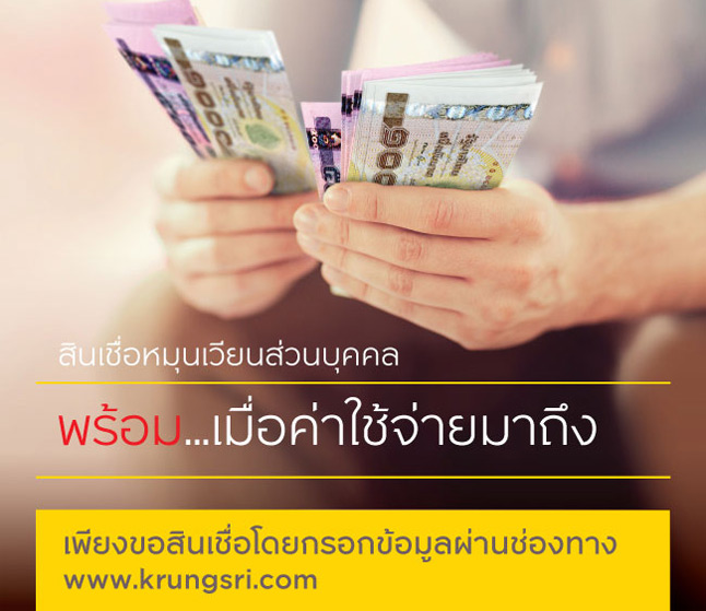 สินเชื่อหมุนเวียนส่วนบุคคล จาก ธนาคาร กรุงศรีอยุธยา ตอบรับกับทุกความสุขและความต้องการของคุณในโอกาสพิเศษ หรือเผื่อไว้..ให้พร้อมรับกับทุกสถานการณ์ที่ไม่แน่นอนได้ทันที ไม่เอาไว้เป็นเงินฉุกเฉินเพื่อค่าใช้จ่าย ใช้เป็นเงินทุนในการประกอบอาชีพ หรือ จเอาไว้เป็นเงินสำรองใช้จ่ายต่างๆ