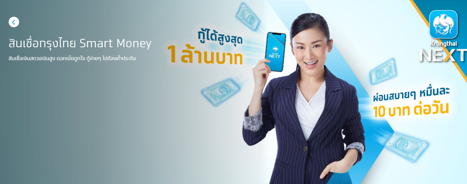 ธนาคารกรุงไทย ออกสินเชื่อส่วนบุคคล กรุงไทย Smart Money พื่อเป็นอีกหนึ่งตัวเลือกในการช่วยเหลือผู้ที่ประสบปัญหาด้านการเงินในช่วยสถานการณ์การแพร่ระบาดของเชื้อโควิด-19 ซึ่งเหมาะกับทุกอาชีพ สามารถนำไปใช้จ่ายได้ตามที่ต้องการ จะนำไปเงินลงทุน ใช้จ่ายใจการค้าขาย เพื่อสร้างเนื้อสร้างตัว ขยาดธุจกิจ หรือ ใช้จ่ายหนี้ต่างๆ