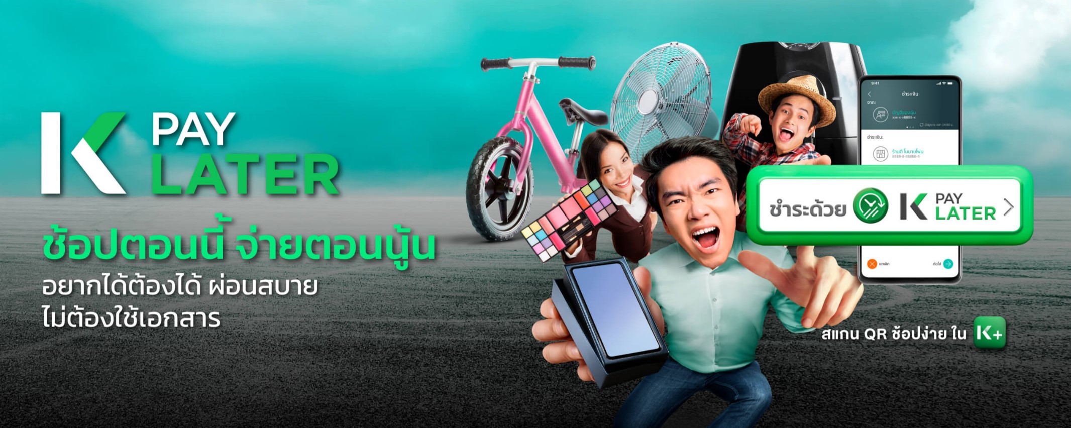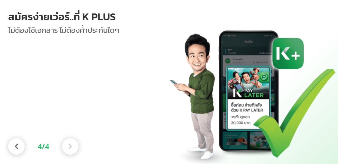 K Pay Later นั้นไม่ใช่ สินเชื่อเงินกู้ด่วน หรือ สินเชื่อเงินสด แต่เป็นสินเชื่อ ที่ให้วงเงินพร้อมใช้ เพื่อนำไปใช้ชำระค่าสินค้า ผ่อนสินค้า ช่องทาง แอป K PLUS หรือ ร้านค้าที่รวมรายการเท่านั้น