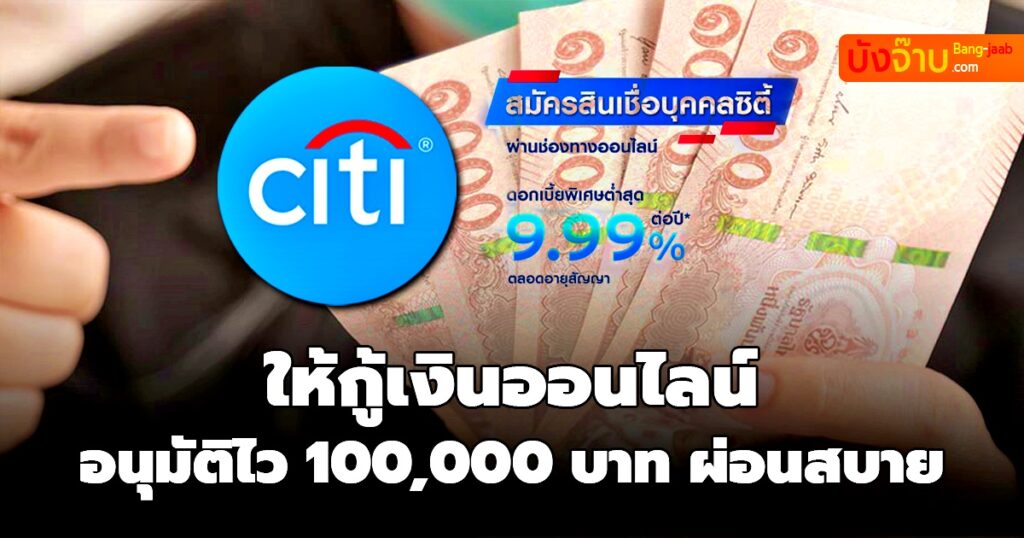 วันนี้ Bang jaab.com จะมาแนะนำ สินเชื่อเงินกู้ สินเชื่อออนไลน์ เงินกู้ถูกกฏหมาย จาก ซิตี้ แบงก์ สำหรับ สินเชื่อบุคคลซิตี้ ให้กู้เงินด่วน รวดเร็วทันใจ ด้วยการสมัครออนไลน์ที่แสนง่าย อนุมัติเงินก้อนในวงเงินที่คุณพอใจในอัตราดอกเบี้ยต่ำ 9.99 %