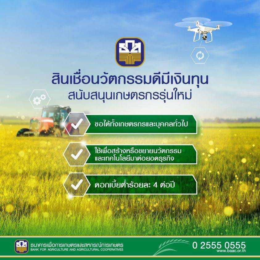 ธ.ก.ส.เปิดรับสมัครเข้าร่วมโครงการ สินเชื่อนวัตกรรมดี มีเงินทุน เปิดโอกาศให้กับผู้สนใจ ลงทุนในอาชีพเกษตร หรือมีการวางแผนอยากทำธุรกิจเชิงเกษตรที่ใช้เทคโนโลยีและนวัตกรรมร่วมด้วยกัน ให้กู้เงินสูงสุด 300,000 บาท บุคคลค้ำประกัน 2 คนขึ้นไป