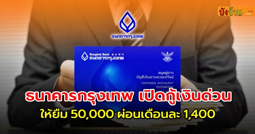 วันนี้ทาง Bang jaab.com มีบริการสินเชื่อกู้เงินด่วน จากธนาคารกรุงเทพ มาแนะนำกัน สำหรับ สินเชื่อบัวหลวงอุ่นใจ มีวงเงินกู้ยืม ตั้งแต่ 15,000 บาท ถึงสูงสุดที่ 1 ล้านบาท ชำระคืนเป็นรายเดือน เริ่มต้นเพียง 500 บาท หรือ 5% ของภาระหนี้คงค้าง ไม่เบิกใช้ ไม่มีดอกเบี้ย ไม่ต้องใช้หลักทรัพย์ หรือบุคคลค้ำประกัน