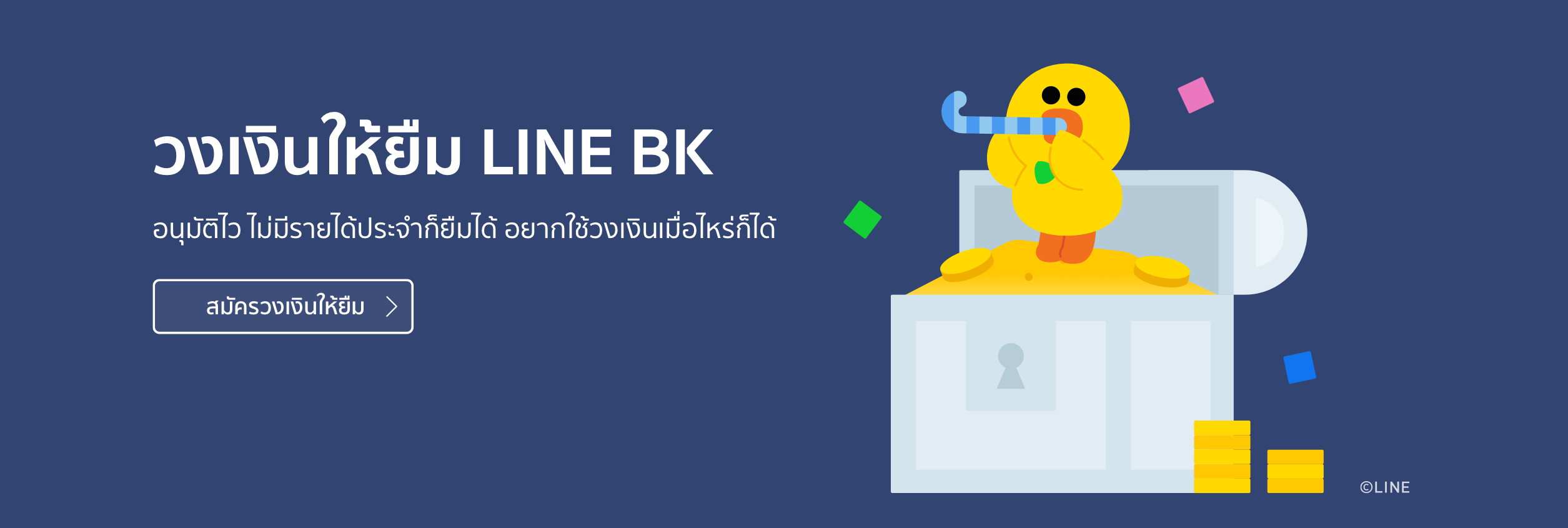 สินเชื่อเงินให้กู้ยืม LINE BK เป็นบริการ Social Banking เต็มรูปแบบรายแรกของไทย ที่เปิด ให้บริการทางการเงินรูปแบบใหม่ทั้ง โอน ออม ยืม จ่ายได้ผ่านไลน์ โดยจุดเด่น ก็คือ บริการ สินเชื่อเงินกู้ยืม ที่สามารถขอ กู้ยืมเงิน ได้สูงสุดที่ 800,000 บาท หรือ จะ กู้ยืมเงิน ด่วน ที่ 5,000-20,000 ก็สามารถยืมได้ สามารถสมัครได้ตัวเอง ตลอด 24 ชั่วโมง ไม่ต้องใช้สลิปเงินเดือน ไม่ต้องค้ำประกัน หรือถึงแม้เป็นอาชีพอิสระ ก็สมัครได้ง่ายๆ ไม่ต้องเอกสารยุ่งยาก