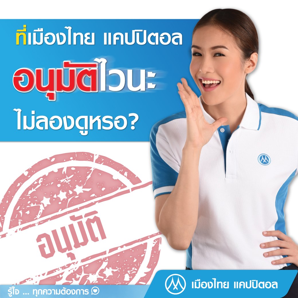 เหมาะกับชาวบ้านที่ทำงานหาเช้ากินค้ำ หรือ ผู้ที่มีรายได้น้อย สินเชื่อส่วนบุลคล จาก เมืองไทยแคปปิตอล ช่วยคุณได้ อนุมัติไว ไม่เช็กบูโร หากสนใจดูรายละเอียดการสมัคร สินเชื่อเงินกู้ ด้านล่างได้เลย