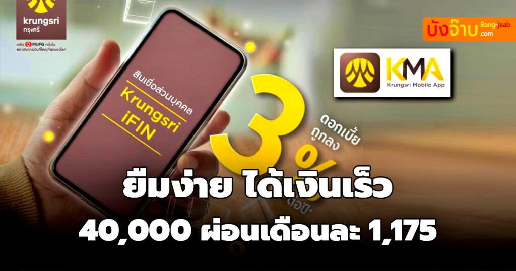 วันนี้ Bang jaab.com จะขอแนะนำ เงินกู้ด่วน สินเชื่อเงินกู้ อนุมัติไว เงินกู้ถูกกฏหมาย สำหรับ สินเชื่อ Krungsri iFIN ให้วงเงินกู้ยืม ตั้งแต่ 30,000 บาท สูงสุด 2 ล้านบาท หรือไม่เกิน 5 เท่าของรายได้ โดยไม่ต้องมีหลักทรัพย์หรือบุลคลค้ำประกัน สมัครง่าย รู้ผลไวภายใน 1 วัน ผ่านทางแอป KMA