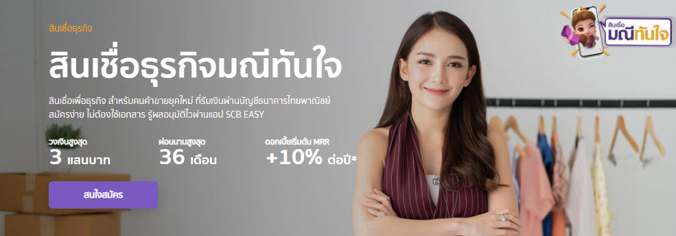 สินเชื่อธุรกิจมณีทันใจ จาก ธนาคารไทยพานิชย์ เป็นสินเชื่อที่ไม่ต้องมีหลักทรัพย์หรือบุคคลค้ำประกัน คิดอัตราดอกเบี้ยแบบลดต้นลดดอก และชำระคืนเป็นงวดรายเดือน โดยเป็นสินเชื่อที่นำเสนอให้แก่ผู้ค้าออนไลน์ที่มีการเดินบัญชีผ่านธนาคารไทยพาณิชย์ โดยมีวัตถุประสงค์เพื่อเพิ่มสภาพคล่องทางการเงิน