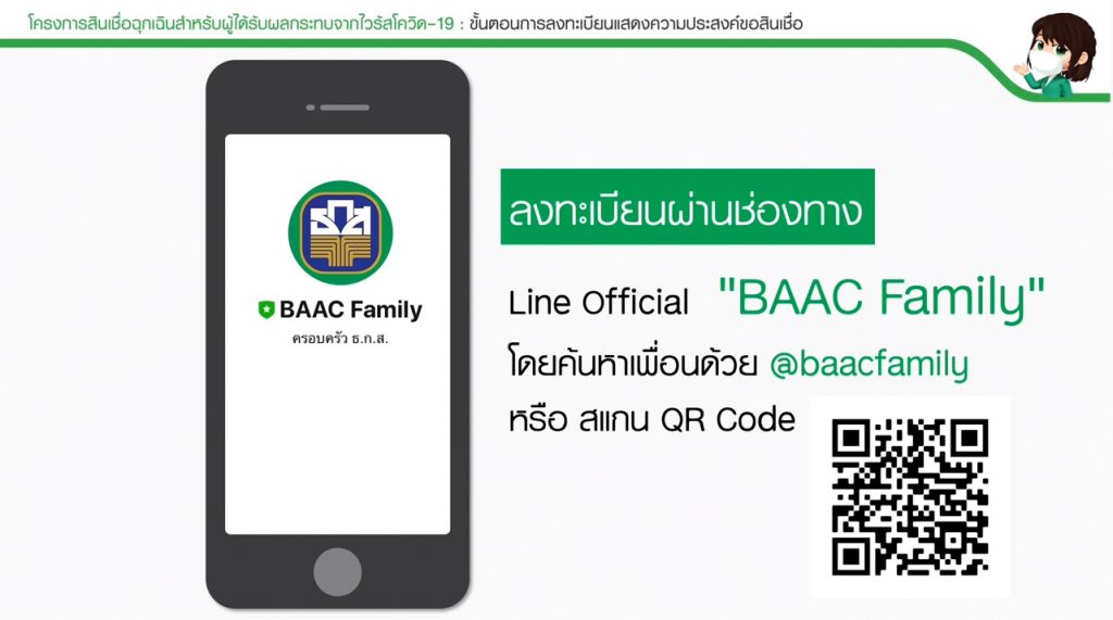 บริการ สินเชื่อสู้ภัยโควิด 19 จาก ธ.ก.ส. สามารถส่งคำขอได้ทาง LINE Official BAAC Family และหลังจากรับเรื่องแล้ว ธ.ก.ส. จะนัดหมายเพื่อทำสัญญา ณ ธ.ก.ส. สาขาในพื้นที่ภูมิลำเนาของลูกค้า ทั้งนี้ ธ.ก.ส. ไม่มีนโยบายการอนุมัติสินเชื่อผ่านช่องทางออนไลน์ นอกจากเป็นเพียงการแสดงความประสงค์ขอใช้บริการดังกล่าว ดังนั้น ขอให้โปรดระมัดระวังการให้ข้อมูลส่วนบุคคลที่นอกเหนือจากช่องทางที่ ธ.ก.ส. กำหนด