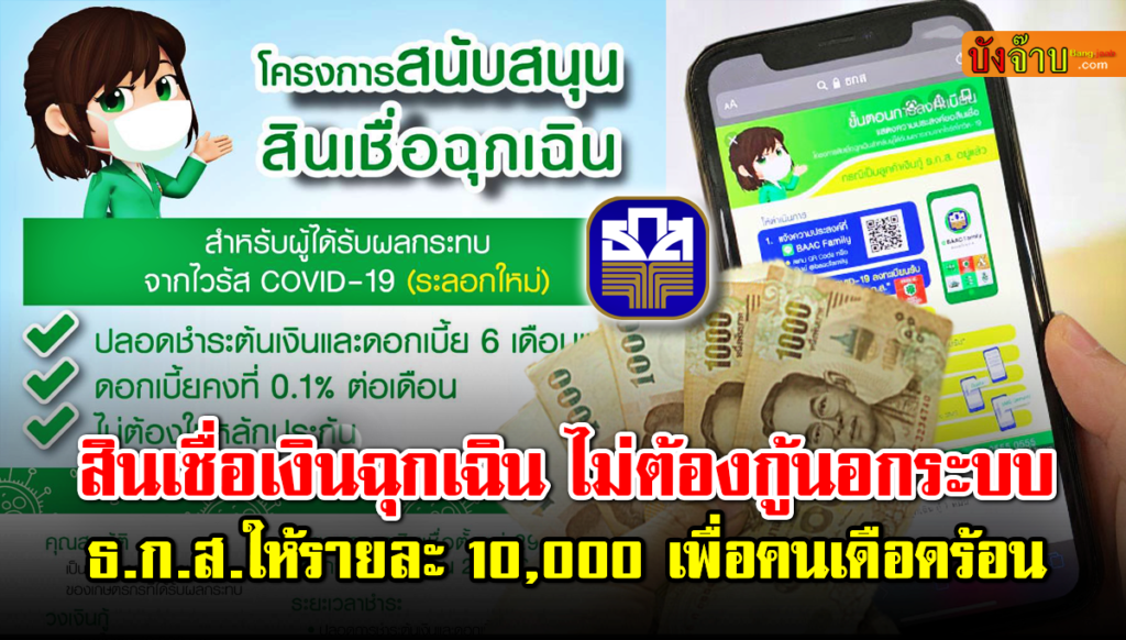 วันนี้ทาง Bang jaab.com มีข่าวดีมาบอก สำหรับ ผู้ที่ได้รับผลกระทบจากสถานการณ์การแพร่ระบาดของไวรัส โควิด 19 ระลอกใหม่ และกำลังต้องการหาบริการ สินเชื่อเงินให้กู้ยืม เพื่อนำมาใช้จ่ายในยามฉุกเฉินเช่นนี้ โดยทาง ธนาคารเพื่อการเกษตรและสหกรณ์การเกษตร (ธ.ก.ส.) ขยายเวลาเปิดรับคำขอสินเชื่อฉุกเฉินให้ กู้ยืมเงิน ได้รายละไม่เกิน 10,000 บาท ไม่ต้องใช้หลักประกัน ปลอดหนี้เงินต้น 6 เดือน