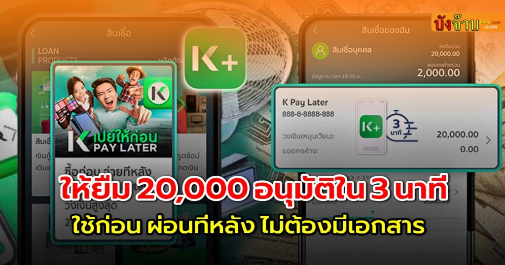 วันนี้ทาง Bang jaab.com มีบริการสินเชื่อใหม่ จาก ธนาคารกสิกรไทย จะมานำเสนอ สำหรับ สินเชื่อ K Pay Later ซื้อก่อน ผ่อนทีหลัง วงเงิน 20,000 บาท อนุมัติไวสูงสุดภายใน 3 นาที ไม่ใช้เอกสาร สมัครได้ทุกอาชีพ