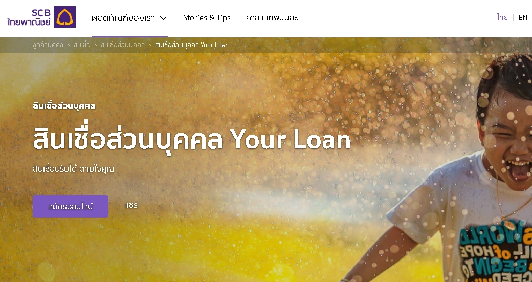 สินเชื่อเงินให้กู้ยืม จาก ธนาคาไทยพาณิชย์ สินเชื่อส่วนบุคคล Your Loan สินเชื่อเงินกู้ยืม ส่วนบุคคลที่เมื่อได้รับการอนุมัติแล้ว จะมีการโอนเงินเข้าบัญชีของลูกค้าทันที เพื่อนำไว้ใช้จ่ายตามความต้องการ ไม่ว่าเป็นการใช้จ่ายในชีวิตประจำกัน จ่ายหนี้ต่างๆ หรือจะเป็นหมุนสำรองเมื่อยามจำเป็นต่อได้ตามต้องการ