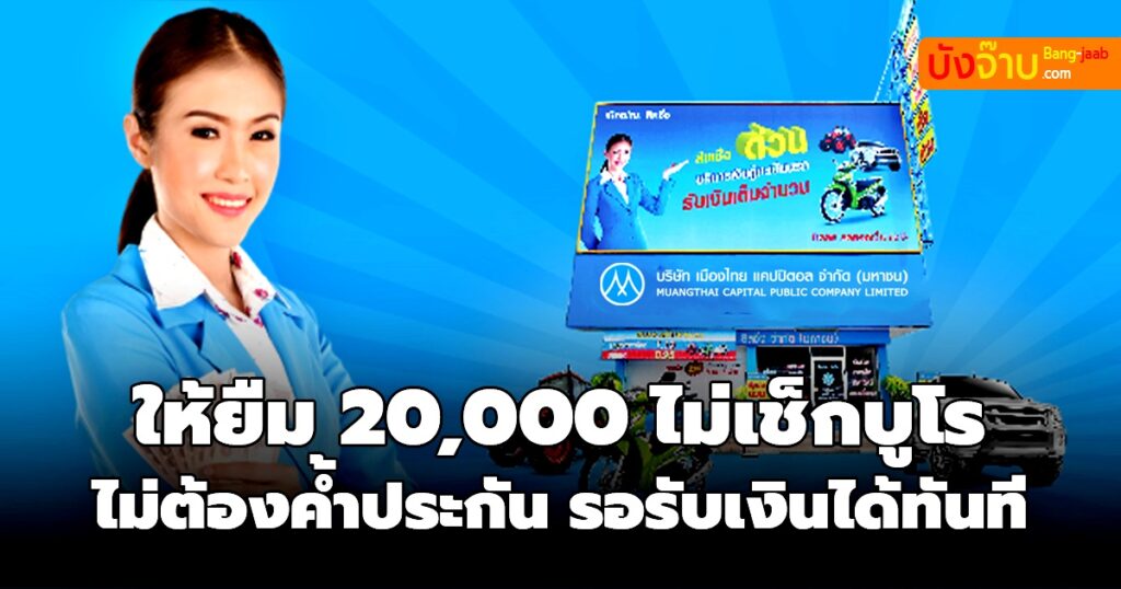 วันนี้ Bang jaab.com จะขอแนะนำ สินเชื่อเงินกู้ ไม่เช็กบูโร เงินกู้ด่วน เงินกู้ถูกหมาย สำหรับ สินเชื่อส่วนบุลคล จาก เมืองไทยแคปปิตอล มีวงเงินกู้ยืม สูงสุดที่ 20,000 บาท ไม่ต้องใช้คนค้ำประกัน อนุมัติเงินทันใจใน 1 วัน