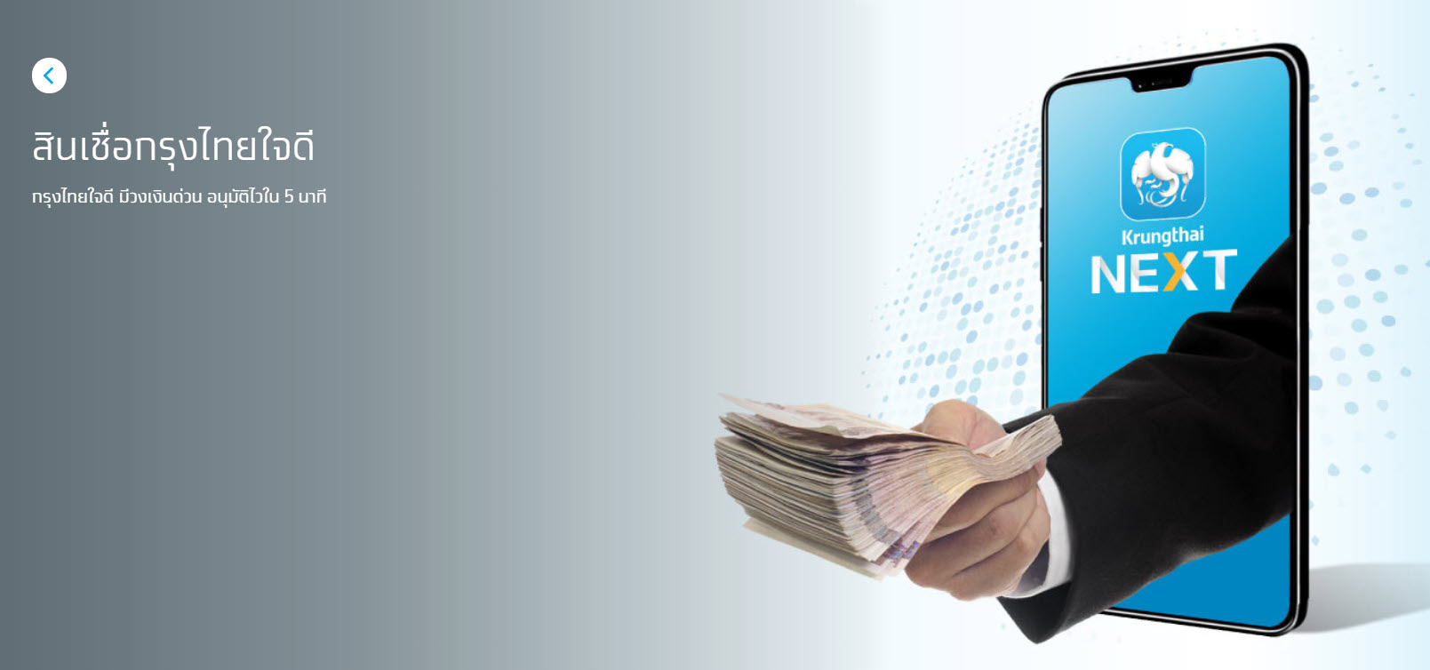 สินเชื่อกรุงไทยใจดี บริการ สินเชื่อเงินให้กู้ยืม จาก ธนาคาร กรุงไทย มีวงเงินกู้ยืม แบบด่วน ที่ตั้งแต่ 5,000-100,000 บาท ผ่านแอปธนาคารกรุงไทย Krungthai NEXT รู้ผลอนุมัติไว ภายใน 5 นาทีซึ่งผู้ที่สามารถ กู้ยืมเงิน สินเชื่อใจดี ได้จะต้องเป็นลูกค้าที่มีบัญชีเงินเดือนกับกรุงไทย