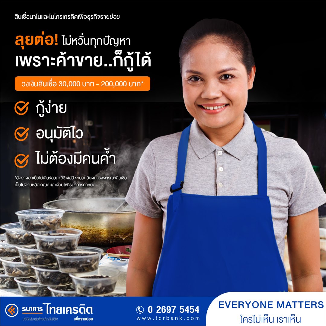 ธนาคารไทยเครดิต เพื่อรายย่อย จำกัด ได้เปิดบริาร สินเชื่อเงินให้กู้ยืม นาโนและไมโครเครดิตเพื่อธุรกิจรายย่อย คุยง่าย ผ่อนสบาย ได้เงินเร็ว สนับสนุนเงินทุนสูงสุด 200,000 บาท ไม่ต้องใช้หลักทรัพย์หรือบุคคลค้ำประกัน ให้พ่อค้าแม่ค้าเข้าถึงเงินทุนในระบบได้อย่างปลอดภัย