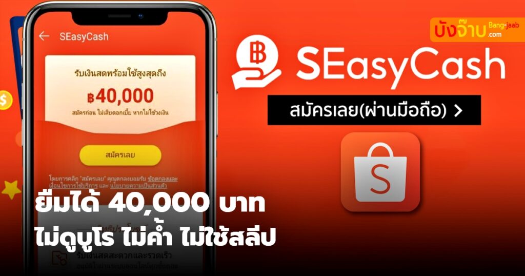 Bang jaab.com จะมาแนะนำ เงินกู้ถูกกฏหมาย สินเชื่อเงินกู้ด่วน เงินกู้ไม่เช็คบูโร สำหรับ สินเชื่อ SEasyCash จากแอป Shopee ให้วงเงินกู้สูงสุด 100,000 บาท ไม่ต้องค้ำ ไม่ใช้เอกสาร สมัครปุ๊บ อนุมัติวงเงินทันใจ